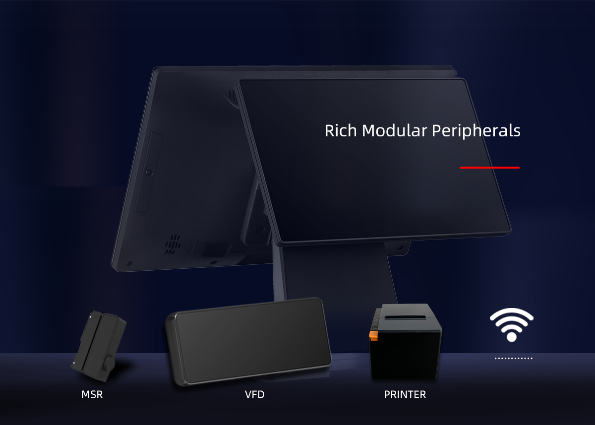 15.6”/16:9 widescreen with 1366*768 resolution Simple and fashionable design, Aluminum Die-casting base Clean cable Management, sleek base with an innovative magnetic cable cover and a LED Logo light(optional) Modular-design: 2nd Display, MSR, I-Button