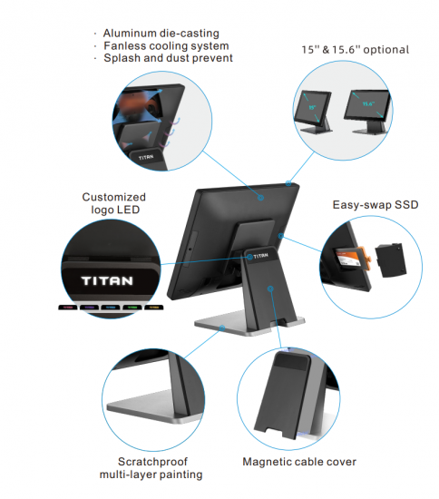 15 inch, Industrial-grade Fan-free MB supporting Intel 11th gen CPU, Full aluminum die-casting, Magnetic cover with LED logo customization